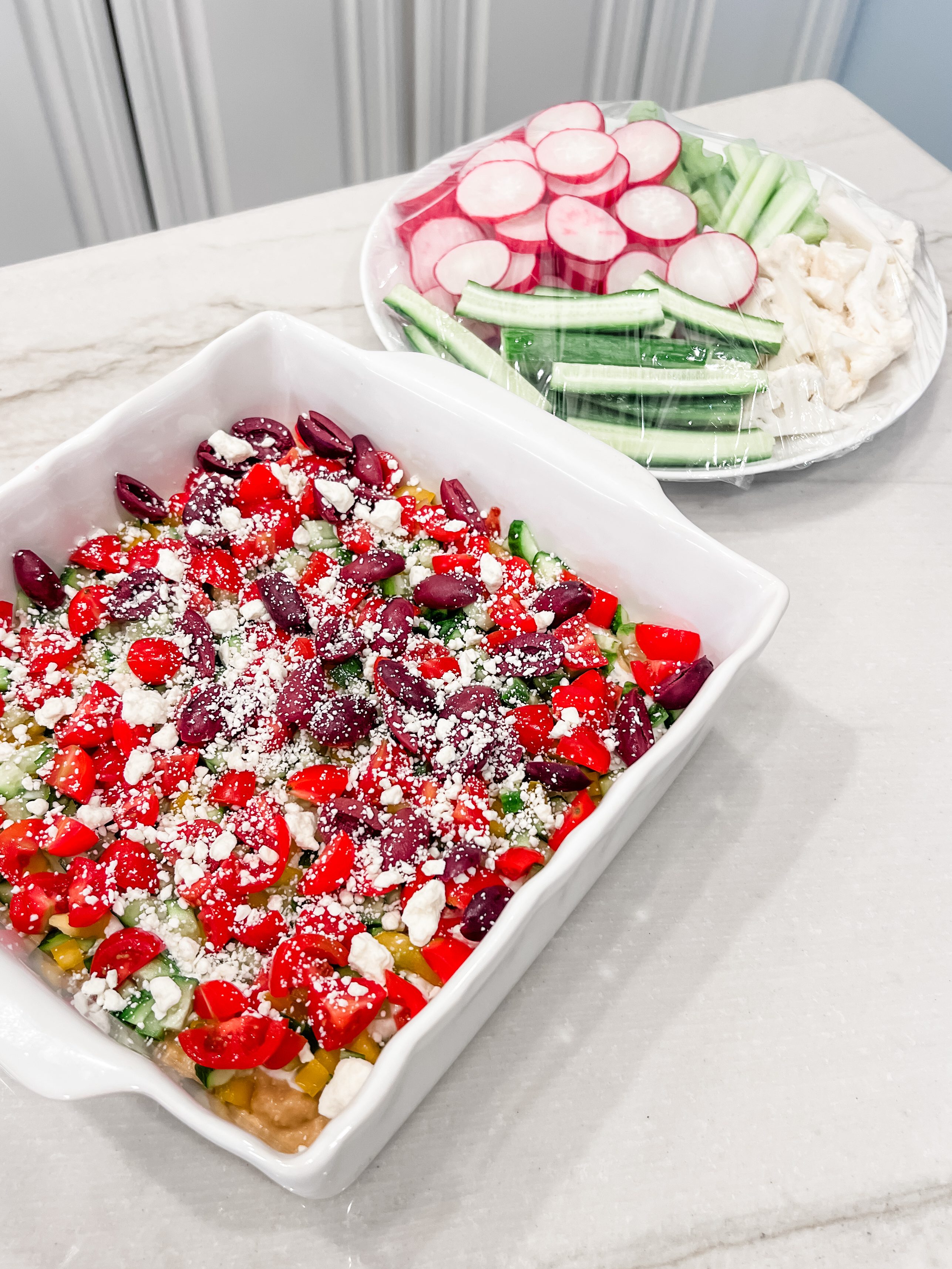 Then the fun part! Decorate with fruit! If I am taking this somewhere, I usually add the fruit with only a few hours to go. Especially cut fruit (like strawberries) can sometimes leak their juices a little. This one above was refrigerated overnight and nothing leaked at all.